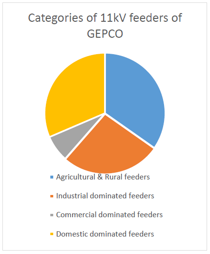 GEPCO has more than 60 no 132 kV Grid stations with 970 11 kV outgoing feeders. These feeders serve the public according to their requirements of load and area. There are four major categories of these feeders: Agricultural and rural feeders, Industrial dominated feeders, Commercial dominated feeders, and Domestic dominated feeders. Detail of these feeders is mentioned below mention Table 2.