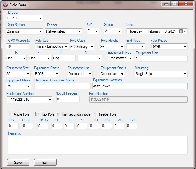 Data is entered in Access Base MDB files through data entry operators as mentioned on the data entry sheet for joining purposes through Arc GIS software. The figure 5 shows the view of data entry software like feeder name, group, date, grid station transformer detail, etc.
