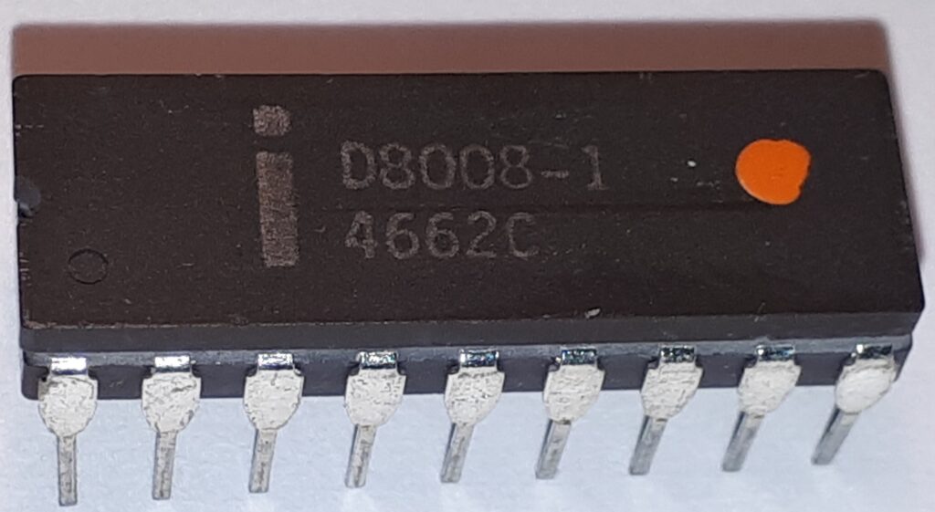 These were the main characteristics 8008: 0.2 MHz clock frequency, 3,500 transistors in an 18-pin DIP package. The address space was 16 kB (14-bit address lines). There was a single 8-bit bus (for data and addresses); as a result, to access memory, several clock cycles were required. In fact, it was necessary to present the 14 address bits in two successive phases, so that the address could be captured on an external latch (first 8 bits and then the remaining 6); the data (8 bits) passed on subsequent machine cycles.