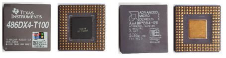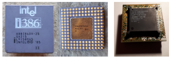 The photos in Figure 56 show two 386s on display: one Intel and one AMD. This second one is surface-mounted and is mounted on a socket to make it compatible with the Intel pinout.