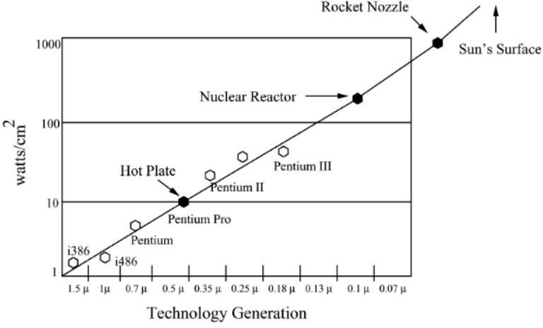 Heat sinks are often mounted over modern microprocessors. With miniaturization and the growth of frequencies, heat dispersion has become a significant problem. To understand this, refer to Figure 67 which shows the power density as a function of the technology.