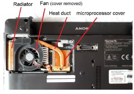 Figure 69 shows the overall heat sink system mounted on the microprocessor Core 2 Duo T5500 (inside the Vaio laptop VGN-1CZ). The heat sink consists of (i) a part that acts as a cover for the processor, (ii) a copper duct; and (iii) a sort of radiator over which the fan passes a flow of air. Schematically it works like this: the radiator is cooled by the airflow generated by the fan; consequently, heat is removed from the assembly formed by the duct and the processor cover.