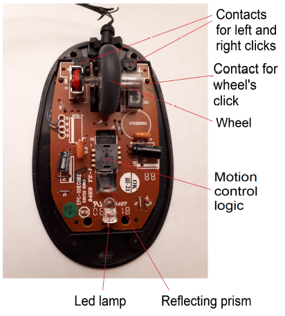 The first mice were mechanical. A portion of a ball (with 2 degrees of freedom) emerged from the underside of the mouse; by moving the mouse the ball rotated and transmitted its movement to two wheels with orthogonal axes to which two encoders were associated, measuring the rotation speed (and therefore the movement along the axes of the two wheels). The mouse logic transmitted trains of pulses corresponding to the movements to the computer and therefore the mouse driver could reconstruct the position of the cursor. Mechanical mice had a significant flaw: they filled with dust, resulting in an impoverishment of their functioning.
