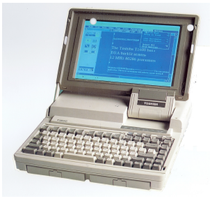 The Toshiba T1600 (Figure 12) was introduced in 1987. it was based on the 80C286 processor at 12 MHz. Memory was expandable to 5 MB. It could mount a hard disk of either 20 or 40 MB, plus a 3.5” flexible disk with 1440/720 kB capacity. It had an EGA standard video (16 colors from a palette of 64 and a resolution up to 640×350 pixels. MS-DOS was the operating system, but it was possible to install Windows 3.0. Its weight was 5.2 kg (with only one battery installed).