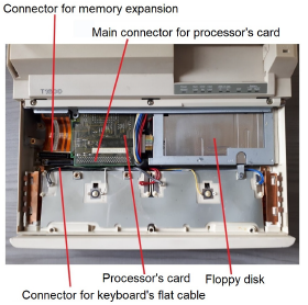 Figure 13 shows the components standing under the keyboard. The keyboard was easily removable and was connected via a flat cable to the indicated connector; a connector was also provided for mounting a possible memory expansion.