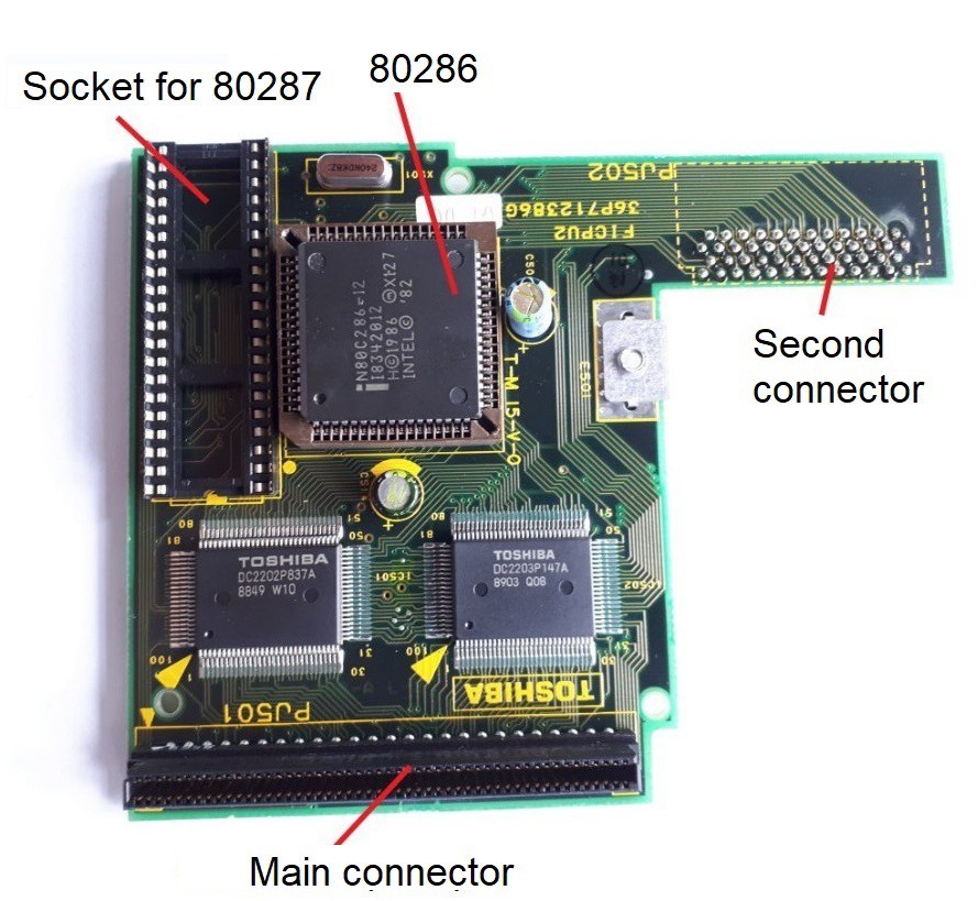 The microprocessor was mounted on the board which appears upside down in Figure 14. In turn, this card was mounted via two connectors on the system board (the second connector is seen from the soldering side in Figure 14); on this board, there was an empty socket for the insertion of the 80287 coprocessor.