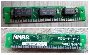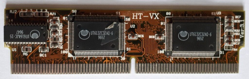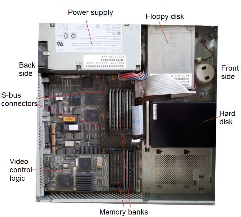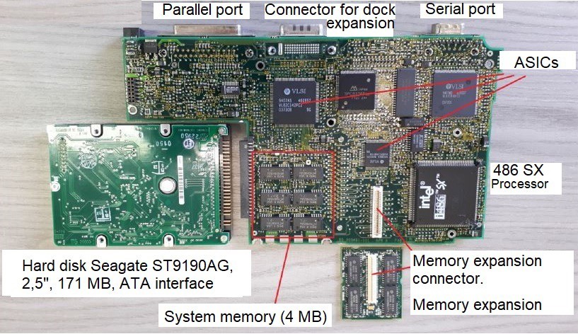 On the side facing downwards, there is the processor, the system memory, and a series of ASICs (Application Specific Integrated Circuits) devices, used by the manufacturer to implement accessory functions. The memory expansion was piggyback-mounted on the motherboard, it used eight 1M by 4 bits Hitachi HM514400B/BL ICs, for a total of 4MB. There was also a connector for dock expansion.