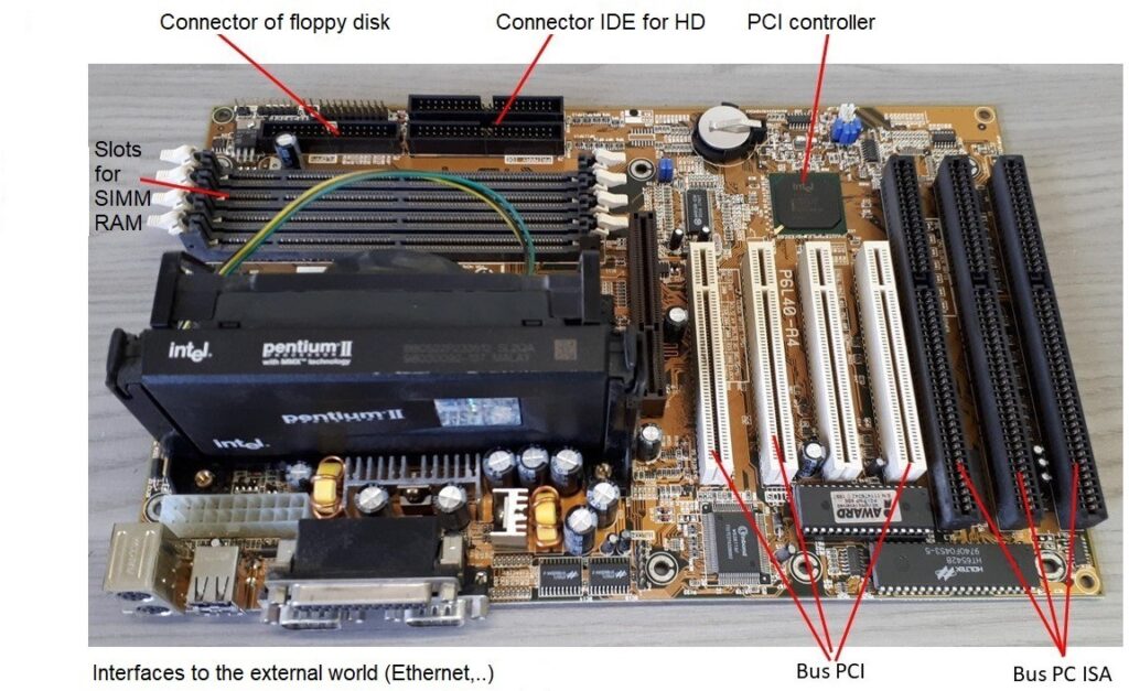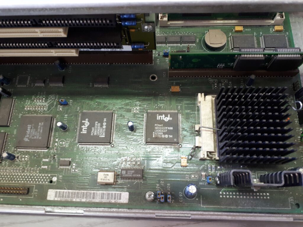 The Computer on display (Figure 19) is a much more recent version of the initial one and is based on a 100 MHz Pentium. This PC is contained in a 36x41x11 cm box. Figure 20 shows (part of) the motherboard.