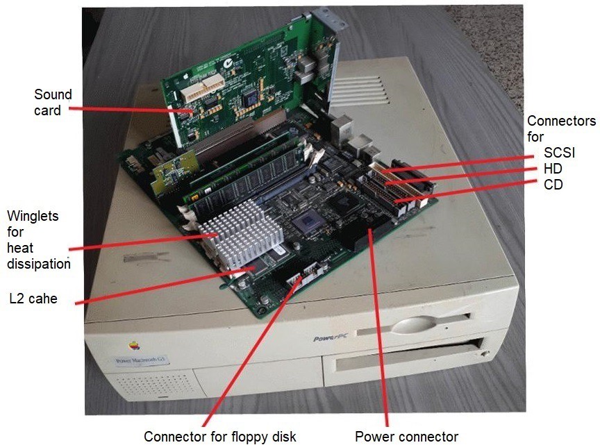 This computer was introduced in November 1997 and produced until April 1998 (replaced by updated versions). At the time of introduction, its price was $2,400. Figure 23 shows the computer box with its motherboard on top of it. The following were the main features of the Power Macintosh G3 M3979. A PowerPC 750 microprocessor (page 20), operating at 233 MHz, mounted on a ZIF (Zero Insertion Force) socket; standard RAM 32 MB, expandable up to 192 MB; L1 Cache 64KB; L2 Cache 512KB (on 117 MHz bus); bus speed 66 MHz; cache bus speed 117 MHz; ROM/Firmware size 4 MB; Standard VRAM 2 MB, expandable up to 6 MB; 1024×768 pixel color display; 3.5″ hard disk, 4.0 GB capacity, IDE/ATA-2 interface optical disk; floppy disk. It had also a SCSI interface for external and internal additional disks. There were a 10Base-T Ethernet port and 3 PCI (Peripheral Component Interface) slots at 33 MHz. The operating system was MacOS 8.0. Motherboard dimensions: 28×20.5 cm.; dimensions of the case: 6.3 x 14.4 x 16.9 cm; weight approx. 10 kg.