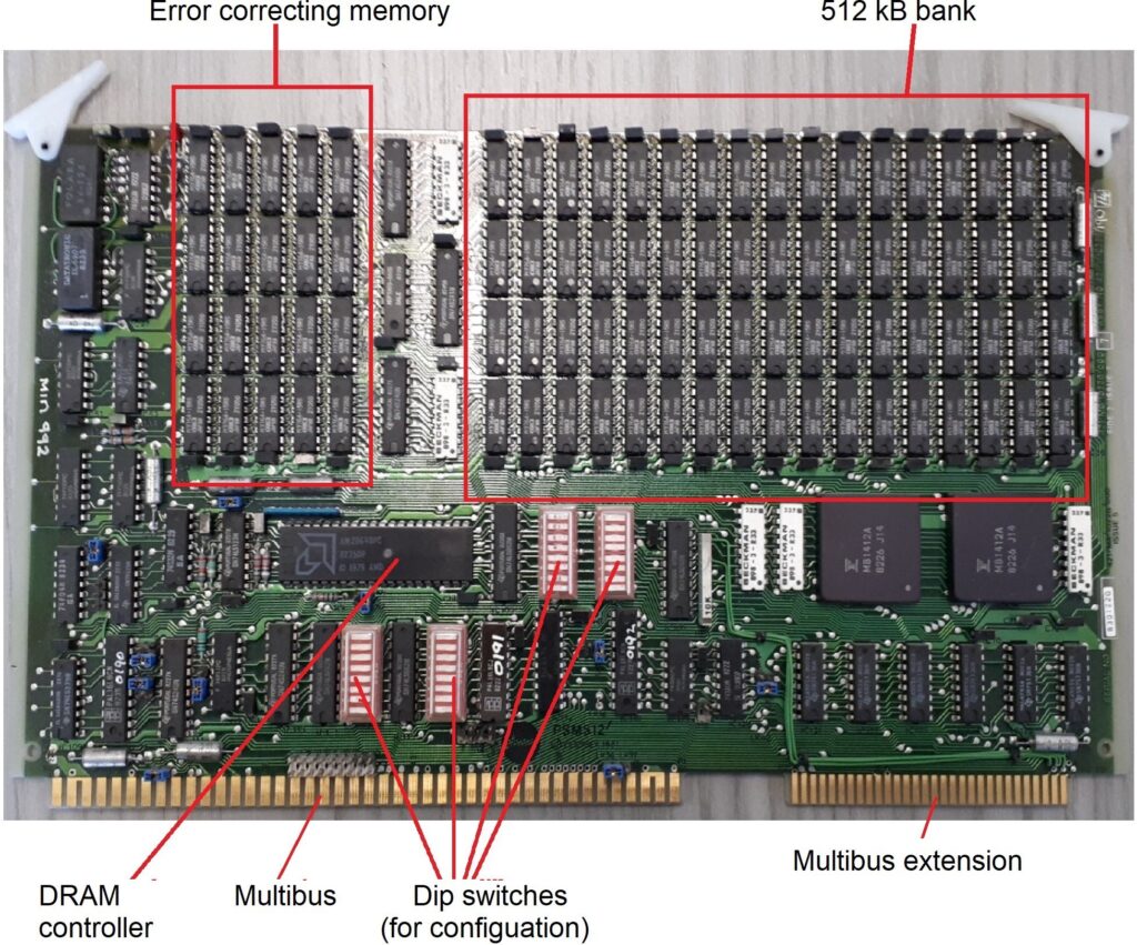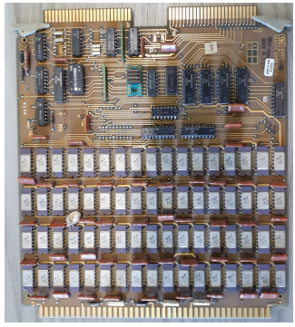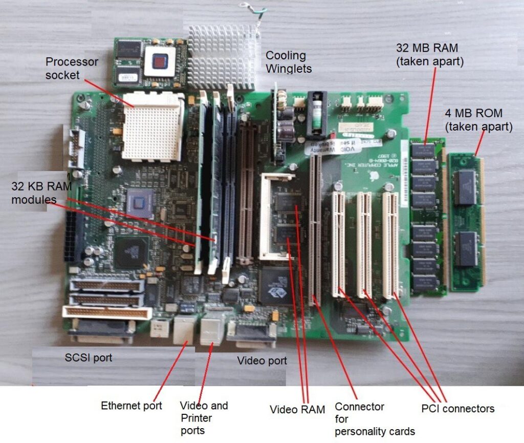 These were the main characteristics of the motherboard: the processor was a Motorola 68000 (in this specific case it is a Hitachi, produced under Motorola license), at 8 MHz (to be precise 7.8336 MHz); it had 512 kB memory, consisting of 16 integrated circuits of 256 Kx1bit, plus two integrated ones for parity control; ROM memory was 64 kB (two chips). In addition, there was a Z8530 serial port controller (produced by AMD under a Zilog license), and a VL6522 Parallel Port/Timer Controller (VLSI). Dimensions were 22×27 cm.