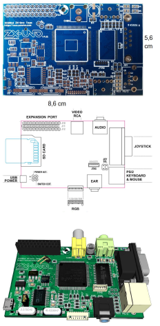 Although the ZX Spectrum is no longer produced, small cards are on sale which allow the implementation of a ZX Spectrum, and other various small computers in the same category as the ZX. Figure 8 shows one such small card the ZX-Uno (V4.1). The card size is 86 by 56 millimeters. It is preferentially oriented towards the creation of the ZX. But it also allows the construction of the Apple II, the VIC-20 (Commodore), the Acorn Atom, the Atari 2600, and many others. Anyway, this requires an appropriate setting of an FPGA (Field Programmable Gate Array), which can be defined via VHDL or Verilog languages.