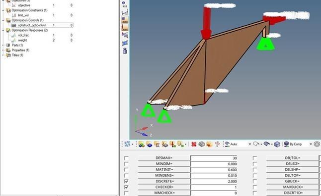 The optimization control panel is employed to define key control parameters, specifically setting the values of discreteness and checkerboard to 2 and 1, respectively as shown in Figure 13. The choice of a discreteness value of 2 significantly influences the tendency of solid elements in topology optimization to converge towards dominant structures, incorporating member size control while adhering to manufacturing constraints. This strategic configuration plays a vital role in guiding the optimization process, ensuring effective and controlled convergence to desired outcomes in the bamboo bike frame analysis.