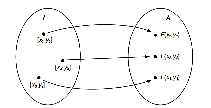 Figure 1 illustrates an example of how the process begins. In this figure, A set of individuals contains three individuals “𝐼” formed by the parameter vectors [𝑥𝑛, 𝑦𝑛], = 1, 2, 3. Each element represents a possible solution to the problem. This population of individuals is randomly generated within the parameter space and then evaluated by the objective function 𝐹, resulting in a set of skills “A”.