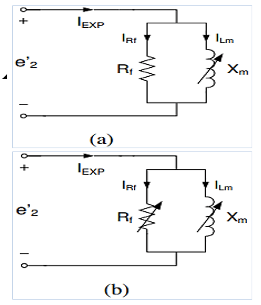 Figure 2 shows the models of the transformer core, in which its parameters (time variations) are referred to the low voltage winding. The loss resistance (𝑅𝑓) represents magnetic losses. Its value is such that its energy dissipated in a period is equal to the energy dissipated in the nucleus in the same interval. The magnetization reactance (𝑋𝑚) is opposition to change in magnetization and represents the behavior of the nucleus saturation. Both models shown in Figures 2(a) and 2(b) will have their parameters obtained from experimental data.