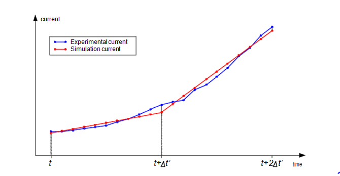 The proposed algorithm optimization technique determines the time varying 𝑅𝑓(𝑡) and 𝑋𝑚(𝑡) parameters using the Genetic Algorithm as a method for estimating these parameters. The procedure consisted of considering the constant parameters over short time intervals (𝑡′). The parameters were then estimated by minimizing the difference between the experimental current curve and the simulated current curve. The time interval “𝑡” corresponds to an “n” iteration of the algorithm. For ease of understanding, Figure 3 illustrates how AdG algorithm estimates parameters by minimizing the difference between experimental current curves (𝐼𝐸XP in blue) and simulated current (𝐼AG in red).
